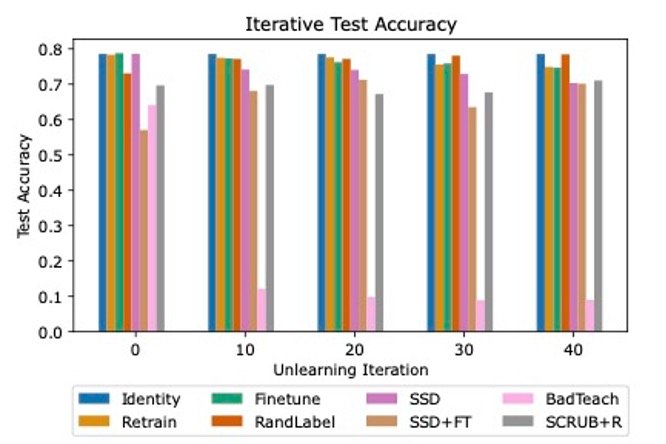 3) Analyze unlearning algorithm performance over repeated applications of unlearning (that is, iterative unlearning), especially for degradation of test accuracy performance of the unlearned models. Since machine learning models are deployed in constantly changing environments where forget requests, data from new users, and bad (or poisoned) data arrive dynamically, it is critical to evaluate them in a similar online setting, where requests to forget datapoints arrive in a stream. At present, very little research takes this approach.