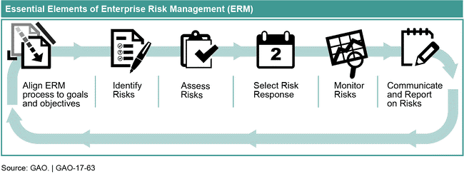 Most risk management standards, such as those from ISO, COSO, and NIST, and have common key processes. In its best practices for an enterprise risk management program, the Government Accountability Office (GAO) identified six essential elements: