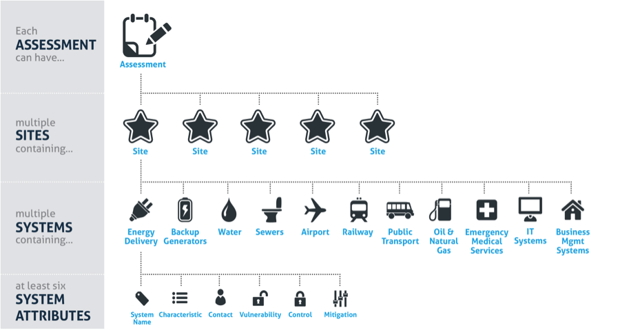 Below we have included an image of a data model, which shows the hierarchy and relational qualities that each assessment has to present and future objects in the system. Each assessment can have multiple sites. For each site there are multiple systems, and for each system there are at least six system attributes collected to describe the platform, configuration, vulnerabilities, controls, mitigations, and responsible contact.