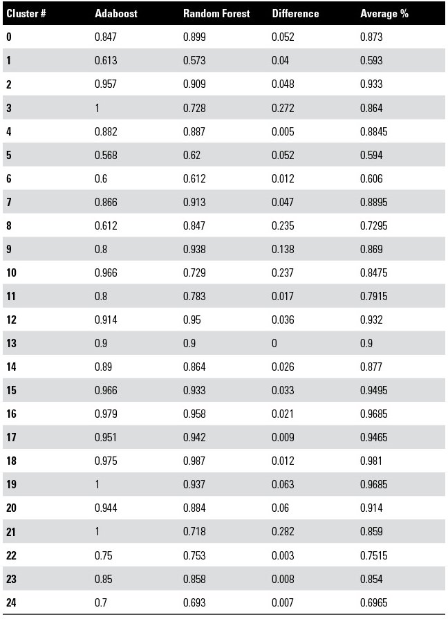 The table below shows the confidence percentage of a specific cluster being malicious by Adaboost and Random Forest. The first column is the cluster number, the second is the Adaboost confidence percentage, the third column is the Random Forest confidence percentage, the fourth column is the difference in the two confidence percentages and the fifth column is the average of the two confidence percentages for each cluster. The difference in confidence percentage was minimal in most cases implying a strong agreement by both Adaboost and Random Forest on the certainty of a cluster being malicious or not. Clusters 3, 19, and 21 had 100 percent confidence by Adaboost and none had similar confidence by Random Forest with cluster 19 the closest at 93.7 percent. Clusters 18,19, and 20 ranked highest in Random Forest and had much more similar scores in Adaboost. The average of the two confidence scores is very revealing with clusters 18,19,15,16 ranking the highest. Cluster 18 was the highest average confidence percentage overall, that cluster consisted of 4 samples, 3 were Trojan.generic and one was variant.symmi.