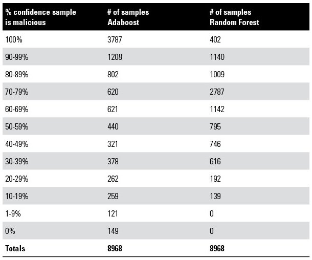The table below shows the number of individual samples with their confidence percentage for Adaboost and Random Forest. From the results, Random Forest did not have 0 percent confidence of a sample being malicious, implying no false negatives were produced. Adaboost had 0 percent confidence for 149 samples which can be equated as 1.6 percent false negative rate. Random Forest placed most samples in the 60-99 percent confidence range where Adaboost had the majority in 90 to 100 percent range. The results show a tradeoff between no false negatives but lower confidence in random forest or much higher confidence with some false negatives in Adaboost. In practice, low or no false negatives is preferred since one missed malware can be enough to comprise an entire system, its users and data.