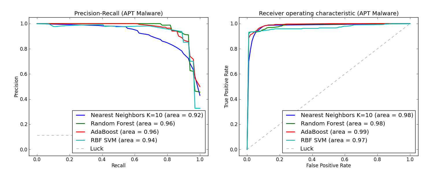 According to the graphs below, we observe that these popular classification algorithms are consistently able to distinguish between benign and malicious samples, i.e., experiencing >=98 percent average area under the PR curve and >= 97 percent average area under the ROC curve. Additionally, for the particularly important case of advanced persistent threat malware, Random Forest and AdaBoost, well regarded ensemble methods, experienced more than 96 percent average area under both curves, further indicating that the runtime features we selected are extremely useful in identifying the malicious or benign nature of a sample.