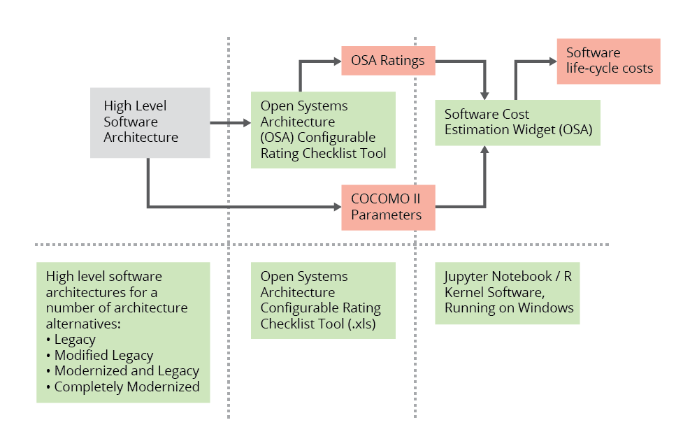 This SEI work incorporates previous work in the areas of software architecture evaluation, software cost modeling, and assessment of open systems architectures. Figure 1 shows how the toolset enables a program to perform an open systems architecture assessment on a selected software architecture and then to provide software cost-estimation inputs, including assessment ratings, to a COCOMO II-based software cost-estimation tool (MS Excel) for the selected software architecture. A widget in a popular statistical analysis language called R combines the COCOMO II parameters with the open systems architecture ratings. These results can then be applied to compare predicted software lifecycle cost estimates among multiple software-architecture alternatives (e.g., legacy, modified legacy, modernized and legacy, completely modernized) early in the system lifecycle.