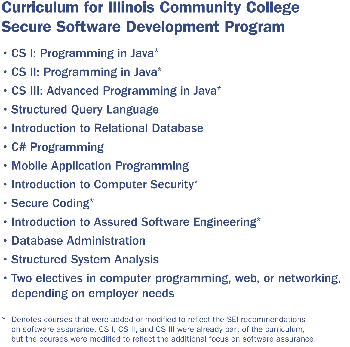 At this point the ICC faculty members began integrating the SEI Software Assurance (SwA) curriculum with their own. The SwA curriculum recommendations for community colleges consisted of the six courses described earlier. ICC faculty consulted with employers to determine which SwA courses were needed in addition to the SEI recommended courses.