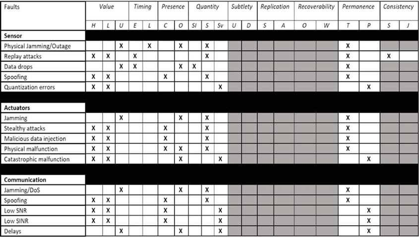 Using this list of attacks on UAVs and those on UAV platforms, we next identified their properties in terms of the taxonomy criteria introduced by the SEI’s Sam Procter and Peter Feiler in The AADL Error Library: An Operationalized Taxonomy of System Errors. Their taxonomy provides a set of guide words to describe errors based on their class: value, timing, quantity, etc. Table 1 presents a subset of those classes as they apply to UAV faults and attacks.