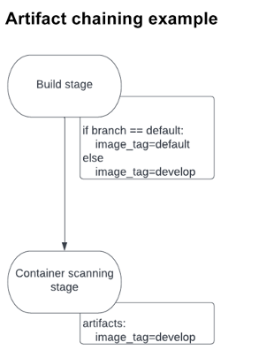 In one instance, a build job created an image tag that changed depending on the kind of branch on which it was being deployed. The tag was saved as an artifact and passed along to the next stage: container scanning. This stage required the correct image tag to perform the scanning. If the wrong tag was provided, the job would fail. Since the tag name could change depending on the build job, it could not work as a global variable. By passing the tag along as an artifact, however, the container-scanning stage was guaranteed to use the right tag. You can see a diagram of this flow below: