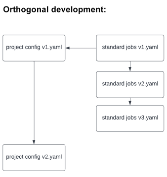 After we rolled out the template to all teams, I realized that any changes to the template meant that every team would have to implement the changes themselves, which incurred inefficient and unnecessary work (on top of the features that teams were working to develop). To avoid this extra work, the standard security template could be included as a dependency on their own project template (like code libraries are imported on files) using Yaml’s include command. This approach allowed developers to pass down project-specific configurations as variables, which would be handled by the template. It also allowed those developing the standard template to make necessary changes in an orthogonal way, as below: