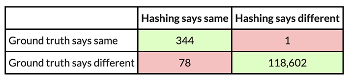 - Recall: Of the equivalent function pairs, how many did hashing correctly declare as equivalent? This is equal to TP / (TP + FN).