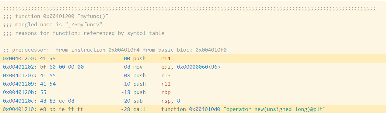 As an example, I compiled this simple program oo.cpp with g++. Figure 1 shows the beginning of the assembly code for the function myfunc (full code):
