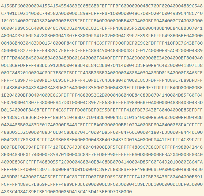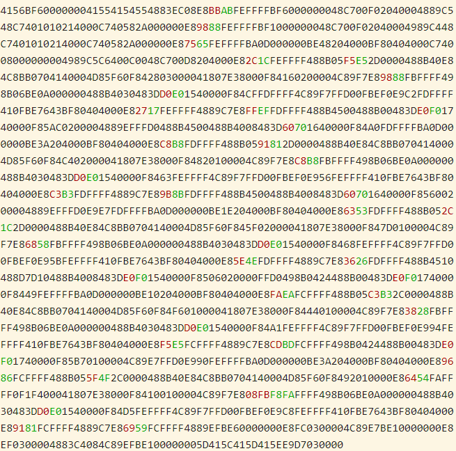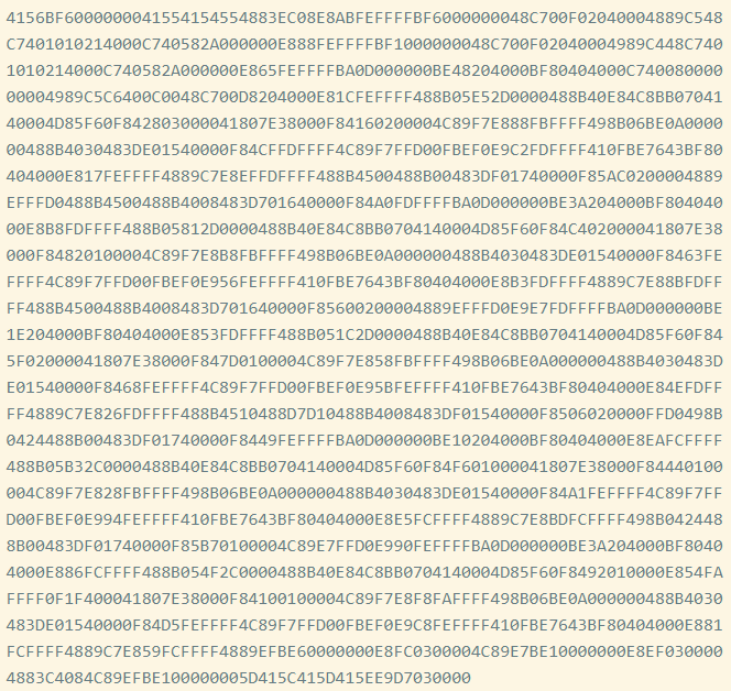 In the first highlighted line of Figure 1, you can see that the first instruction is a push r14, which is encoded by the hexadecimal instruction bytes 41 56. If we collect the encoded instruction bytes for every instruction in the function, we get the following (Figure 2):