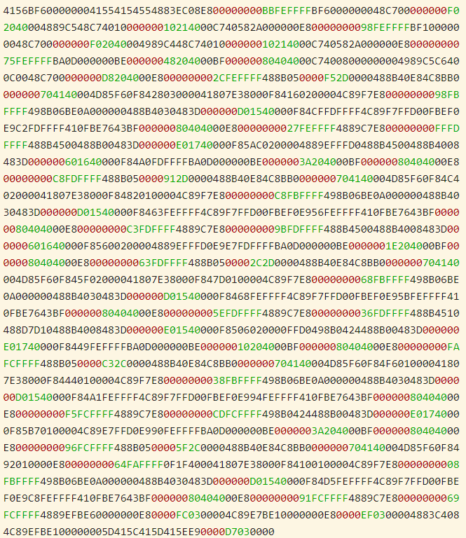 The following visual diff (Figure 6) shows the differences between the exact bytes and the PIC bytes on myfunc in oo.gcc. Red represents bytes that are only in the PIC bytes, and green represents the exact bytes. As expected, the first change we can see is the byte sequence bb fe ff ff, which is changed to zeros.