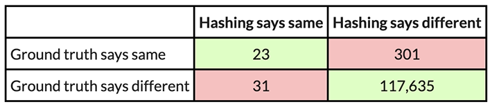 So, when does PIC hashing work well and when does it not? To answer these questions, we're going to need an easier way to evaluate the quality of a confusion matrix as a single number. At first glance, accuracy seems like the most natural metric, which tells us: How many pairs did hashing predict correctly? This is equal to