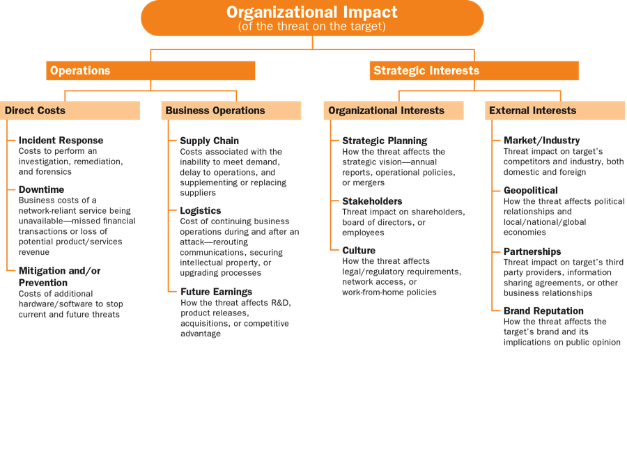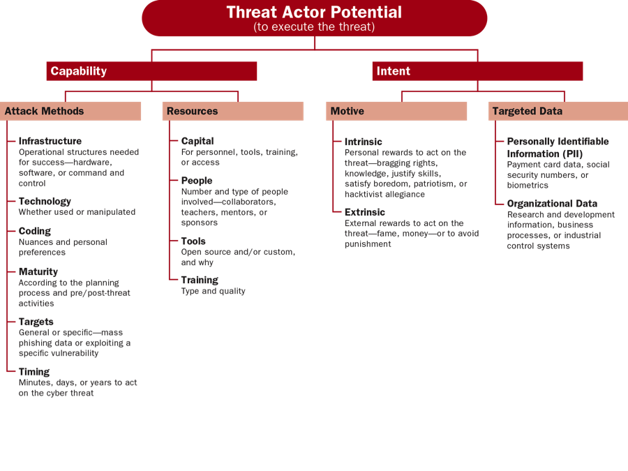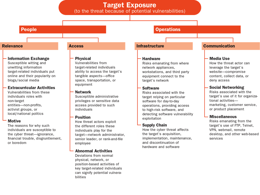 - A civil service federal government agency was monitoring open source publications from an entity known to sponsor cyber threat actors who frequently targeted the agency. By examining threat actor potential, organizational impact, and target exposure, the agency came to understand the motivations of the sponsored cyber threat actors, what effects a successful attack might have on the organization, and what vulnerabilities existed that exposed the agency to the threat. This approach enabled the agency's analysts to narrow down the types of data likely to be targeted, to work with network security experts to create diversions and honey pots, and to proactively defend against the threat.