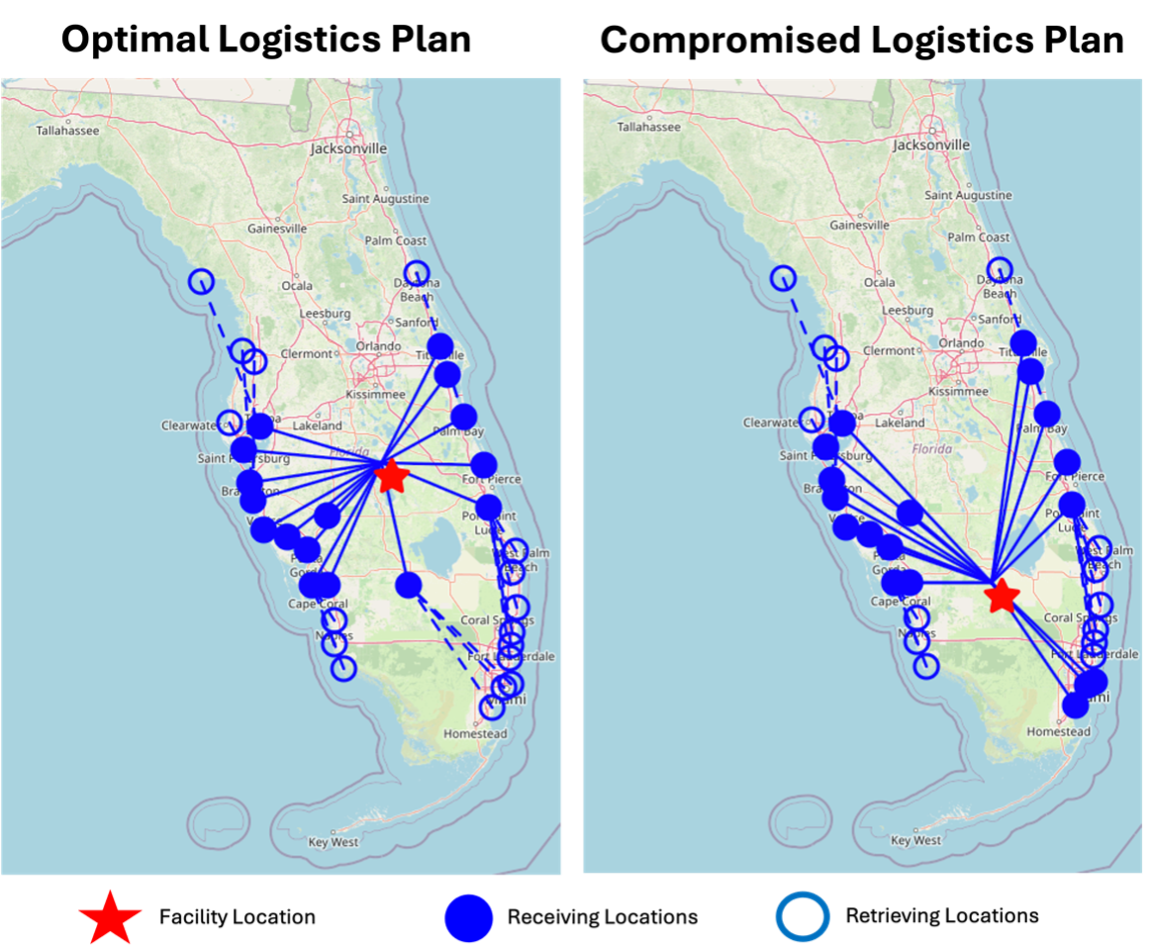 Figure 1 illustrates using a variation of the k-center formulation to compute an optimal policy for the Florida hurricane scenario (left panel). If a cyber-attacker had access to this model and was able to modify its coefficients, then we might end up with a plan such as depicted in the right panel. The recommended central facility location has changed, which could degrade the efficiency of our hypothetical system, or worse, prevent disaster victims from receiving needed supplies.