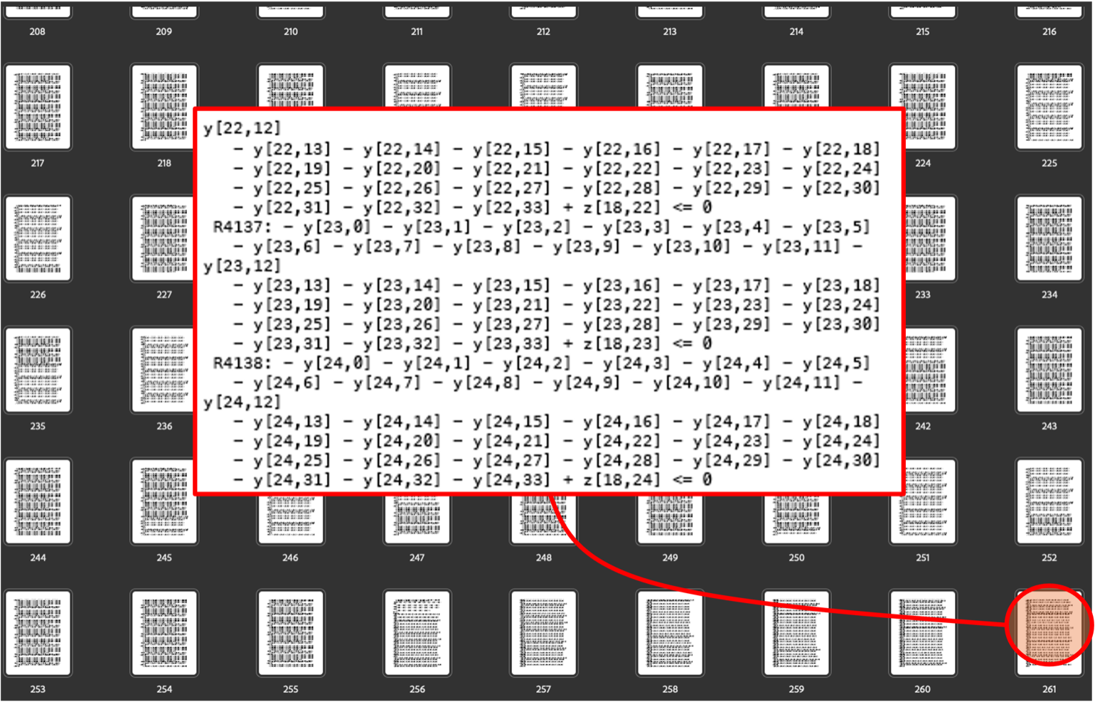 In practice, logistics decision models can be extremely large. For example, the small linear model used for Figure 1 solves a system of 266 pages of linear equations, which Figure 2 depicts. If 100 locations need to be covered, the model would have about 20,000 decision variables, about 40,000 constraints, and up to about 800 million coefficients. Due to the problem of scale, practitioners often use approximation algorithms that can generate reasonably good policies for their specific problems.