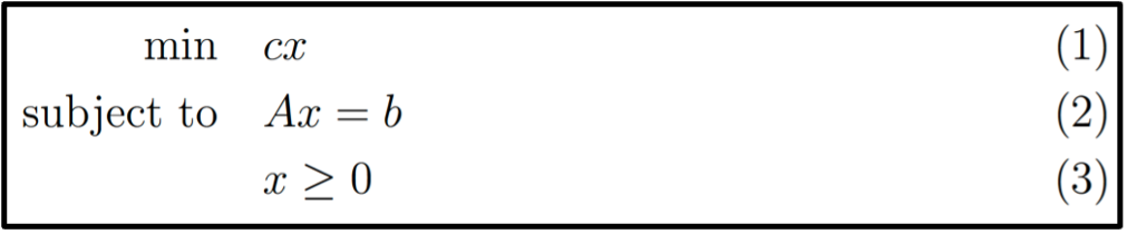 There are many types of logistics problems, including facility location, vehicle routing, scheduling, machine assignment, and bin packing. Logistics problems are often formulated as linear programs. Figure 3 shows the general form of a linear program, which (1) minimizes an objective function (the vector of objective coefficients, c, multiplied by a vector of decision variables, x); (2) subject to a set of constraints (the constraint coefficient matrix, A, multiplied by the vector of decision variables, x, is equal to the constraint requirements vector, b); and (3) with the decision variables, x, taking on positive values. Most logistics problems involve a variation of this model called a mixed integer linear program, which allows some of the decision variables to be integer or binary. For example, a binary decision variable might represent whether to open a supply depot (one) or not (zero) at a given location. Note that Figure 3 is a compact (small) model representation, and its use of vectors and matrices ( c, x , b , and A ) can model any sized problem (for example with thousands of decision variables, tens of thousands of constraints, and millions of coefficients).