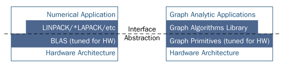 Figure 2. The architecture of the graph algorithms library that captures the separation of concerns between graph algorithms and the complexities of the underlying hardware architecture. It is similar to the architectures of computation-heavy scientific applications that depend on highly tuned implementations of the BLAS specification.