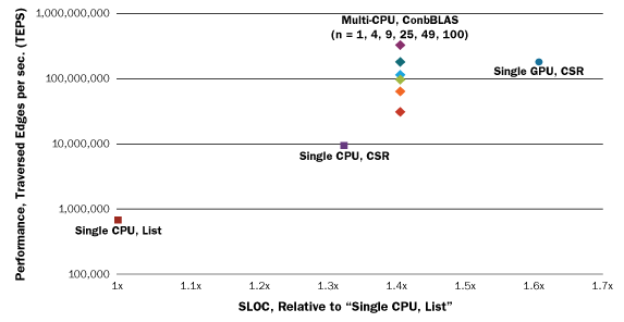 Figure 1. Performance BFS traversal (Kernel 2) relative to source lines of code (SLOC), a proxy for implementation complexity.