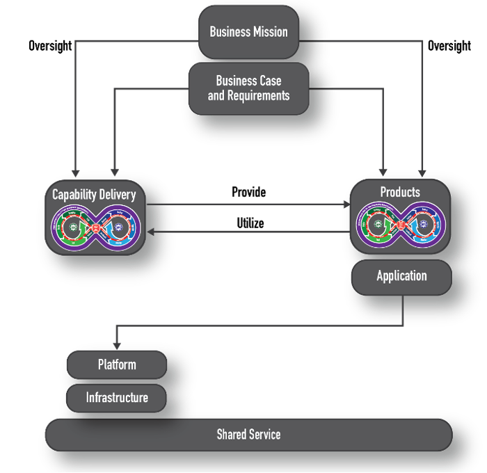 The enterprise provides the business case and requirements to each of the other concerns that are responsible for providing the capability to deliver value and the value itself. Both capability delivery and product development execute using different process steps to achieve their planned outcomes. They, however, need to synchronize with each other periodically to ensure that the software factory and operational environments remain capable of meeting the needs of the products under development.