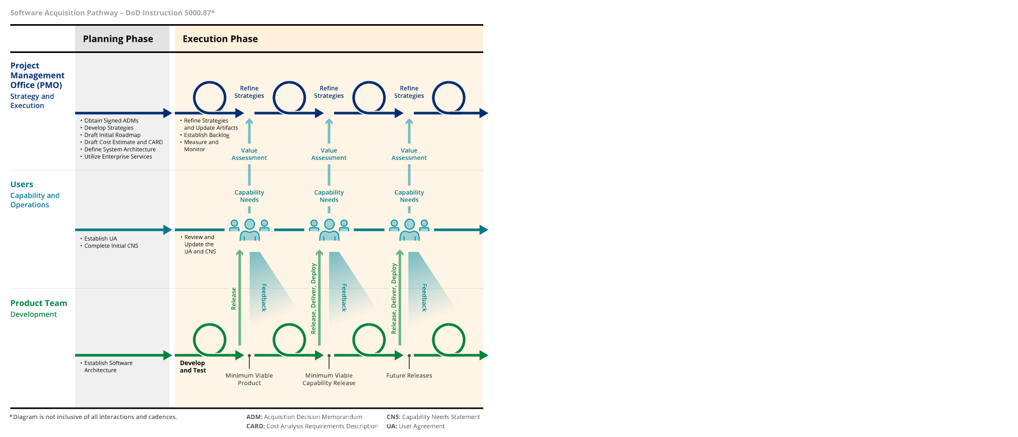 Acquisition TransformationSoftware engineering techniques continue to evolve and improve, with SEI research playing a key role in helping the Department of Defense (DoD) gain the benefits of these improvements and drive changes to revolutionize software acquisition. Our work helps simplify rules, adapt practices to enable decisive actions, improve workforce capability, and accelerate adoption of commercial and scientific innovations. Since its inception, the SEI has been leading the DoD's embrace of modern software engineering methods, such as Agile and DevSecOps. The SEI contributed its expertise to the development of the Software Acquisition Pathway (SWP), which was issued in 2020 as Department of Defense Instruction 5000.87. The policy departed from decades of regulations geared toward hardware acquisition by encouraging these modern software practices to streamline the development and acquisition of software-enabled systems to deliver capabilities at the speed of ever-changing mission needs.