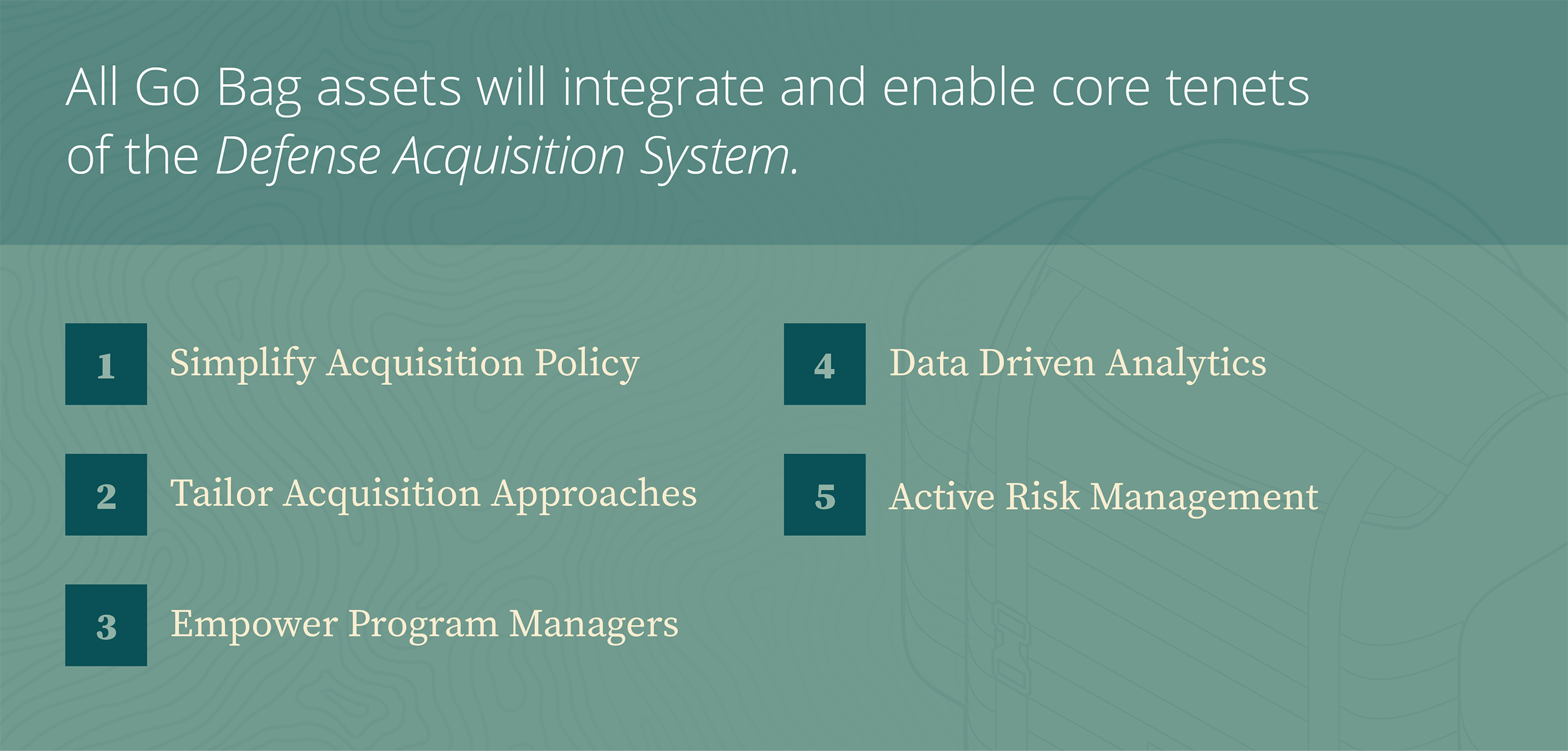 The Go Bag will feature an extensible collection of tailorable kits that program teams can use to enable the delivery of software capabilities at the speed of need. Each kit contains tools and techniques for executing and implementing the elements of your software program. Each kit contains Tactical Guides on topics such as collaborating with stakeholders, obtaining and leveraging the right data, managing expectations, preventing (or recovering from!) common pitfalls, and measuring what matters to stay on course.