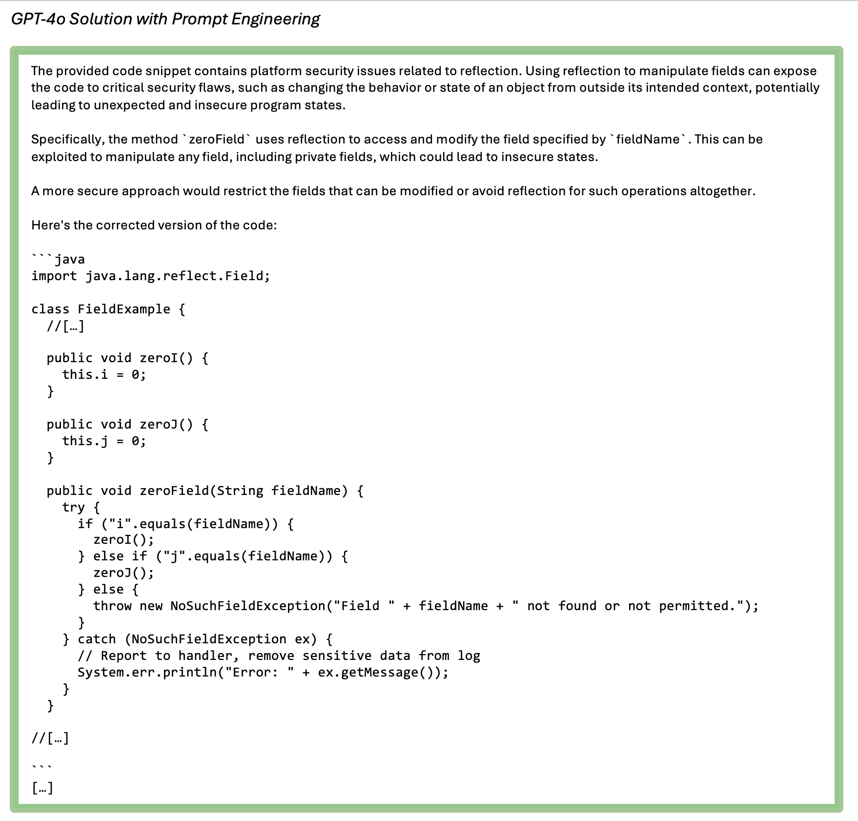 In the original solution, GPT-4o makes trivial suggestions, such as adding an import statement and implementing exception handling where the code was marked with the comment “//Report to handler.” Since the zeroField() method is still accessible to hostile code, the solution is noncompliant. The new solution eliminates the use of reflection altogether and instead provides methods that can zero i and j without reflection.
