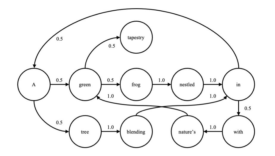 Consider the sentence, “A green frog nestled in a tree, blending in with nature’s green tapestry.” By merging repeated words, it is possible to create a graph of transition probabilities; that is, the probability of each word given the previous one (Figure 1).