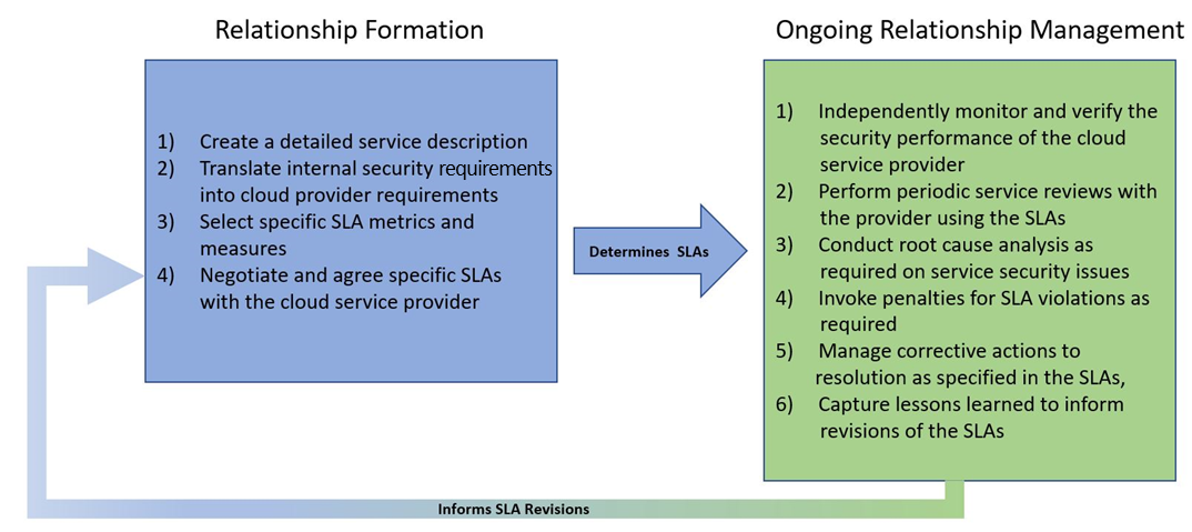 The Relationship Formation phase comprises (1) creation of a detailed service description, (2) translation of internal security requirements to cloud service provider requirements, (3) selection of specific SLA metrics and measurements, and (4) negotiation and agreement on specific SLAs with the cloud service provider. The Ongoing Management phase contains the following processes: (1) independently monitoring and verifying the security performance of the cloud service provider, (2) performing periodic service reviews with provider using the SLAs, (3) conducting root cause analysis as required on service security issues, (4) invoking penalties for SLA violations as required, (5) managing corrective actions to resolution as specified in the SLAs, and (6) capturing lessons learned to inform revisions of the SLAs (see Figure 2: SLA-Creation and Management Framework).