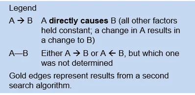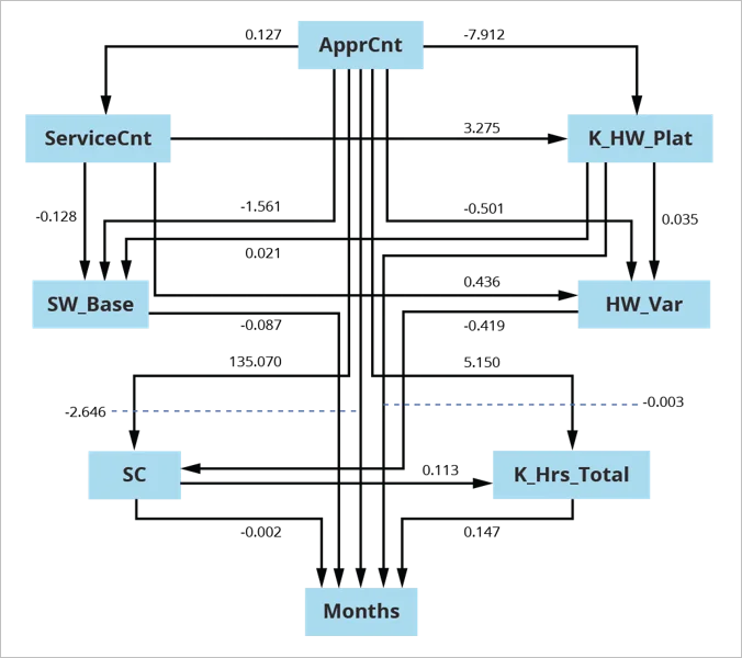 In this example, we segmented a U.S. Army sustainment dataset into [superdomain, acquisition category (ACAT) level] pairs, resulting in five sets of data to search and estimate. Segmenting in this way addressed high fan-out for common causes, which can lead to structures typical of Simpson’s Paradox. Without segmenting by [superdomain, ACAT-level] pairs, graphs are different than when we segment the data. We built the consensus graph shown in Figure 4 above from the resulting five searched and fitted models.