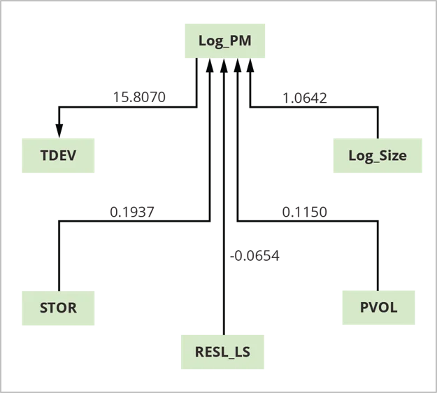 The advantage of the mini-model is that it identifies which factors, among many, are more likely to drive cost and schedule. According to this analysis using COCOMO II calibration data, four factors—log size (Log_Size), platform volatility (PVOL), risks from incomplete architecture times log size (RESL_LS), and memory storage (STOR)—are direct causes (drivers) of project effort (Log_PM). Log_PM is a driver of the time to develop (TDEV).