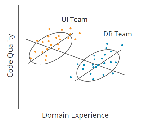 Another challenge to correlations is illustrated by Simpson’s Paradox. For example, in Figure 1 below, if a program manager did not segment data by team (User Interface [UI] and Database [DB]), they might conclude that increasing domain experience reduces code quality (downward line); however, within each team, the opposite is true (two upward lines). Causal learning identifies when factors like team membership explain away (or mediate) correlations. It works for much more complicated datasets too.