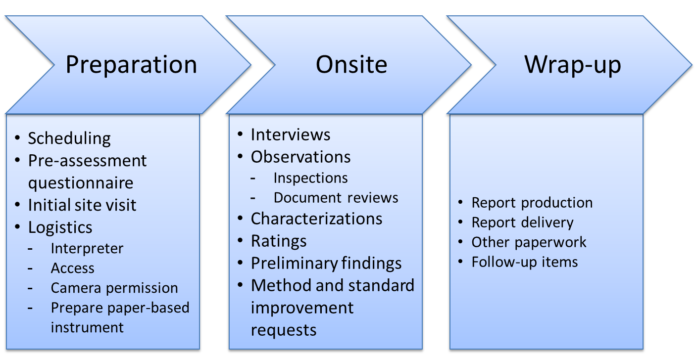 - Onsite: Prepare participants, conduct interviews, examine objective evidence, document objective evidence, verify objective evidence, perform characterizations and ratings, formulate and validate preliminary findings, generate the final results of the assessment, and identify improvements to the method and the standards.