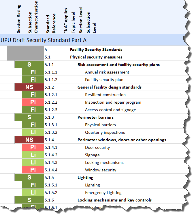Our field instrument is used by the assessment team to keep track of results of interviews and other objective evidence collected. The assessment team uses this information to rate the degree by which each requirement in the standards is implemented. The assessment team also uses our field instrument to generate a summary of the results, in the form of a colored heat map, which is presented to the facility owners and operators. A small segment of a sample heat map is shown in the figure below. The heat map was designed to be easily understood by all relevant stakeholders, ranging from security operations staff to senior decision makers.