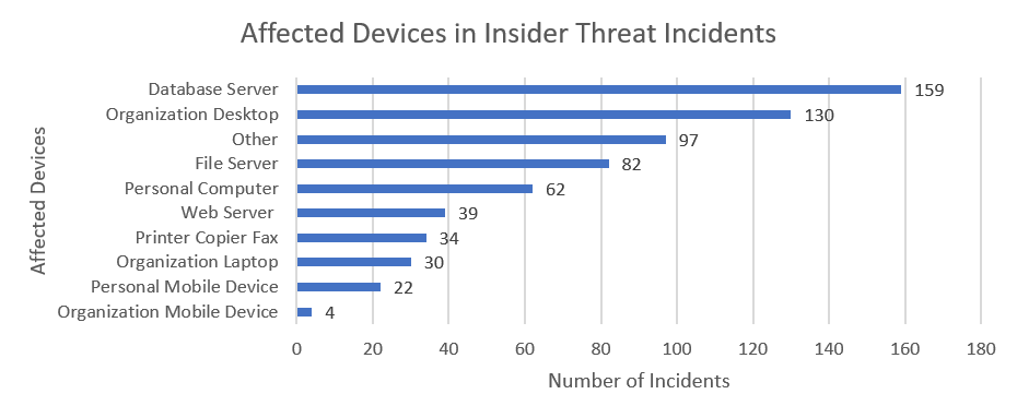 Because the CERT Insider Threat Incident Corpus focuses on technical insiders, or insiders who use technology to commit or conceal their actions, at least one device is affected in each included incident. At times, the court records that inform the corpus do not specify what kind of device the insider targeted, only that an organization-controlled device was affected. Even so, our corpus contains more than 500 cases of categorized, affected devices.