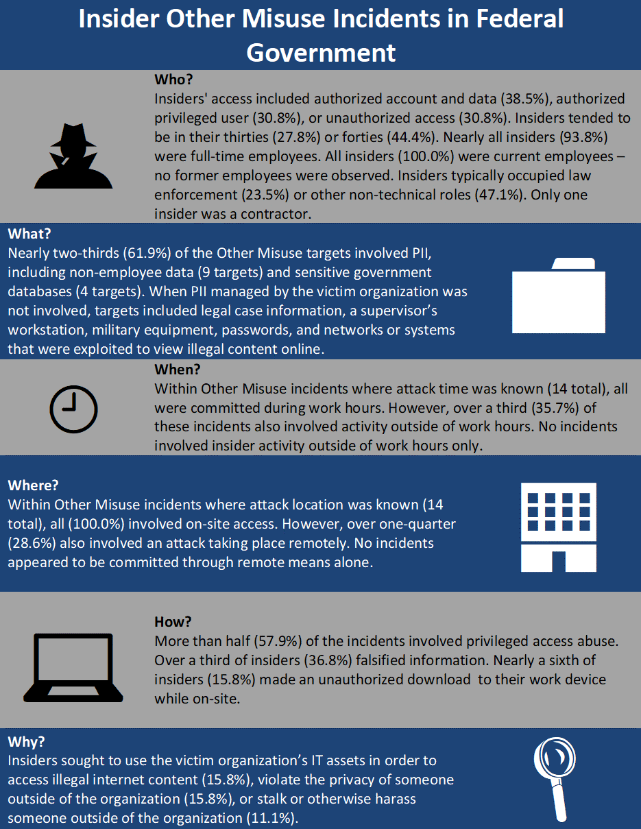 Other Misuse was the second-most common form of insider threat in federal government. These incidents generally involved insiders abusing access to devices or systems for reasons not including financial gain (often the case in Fraud or Theft of IP) or revenge (typical in IT Sabotage). While these incidents are not typically related to an immediate loss of revenue or system availability, they have potential to cause reputational damage to or generate liability concerns for an organization.