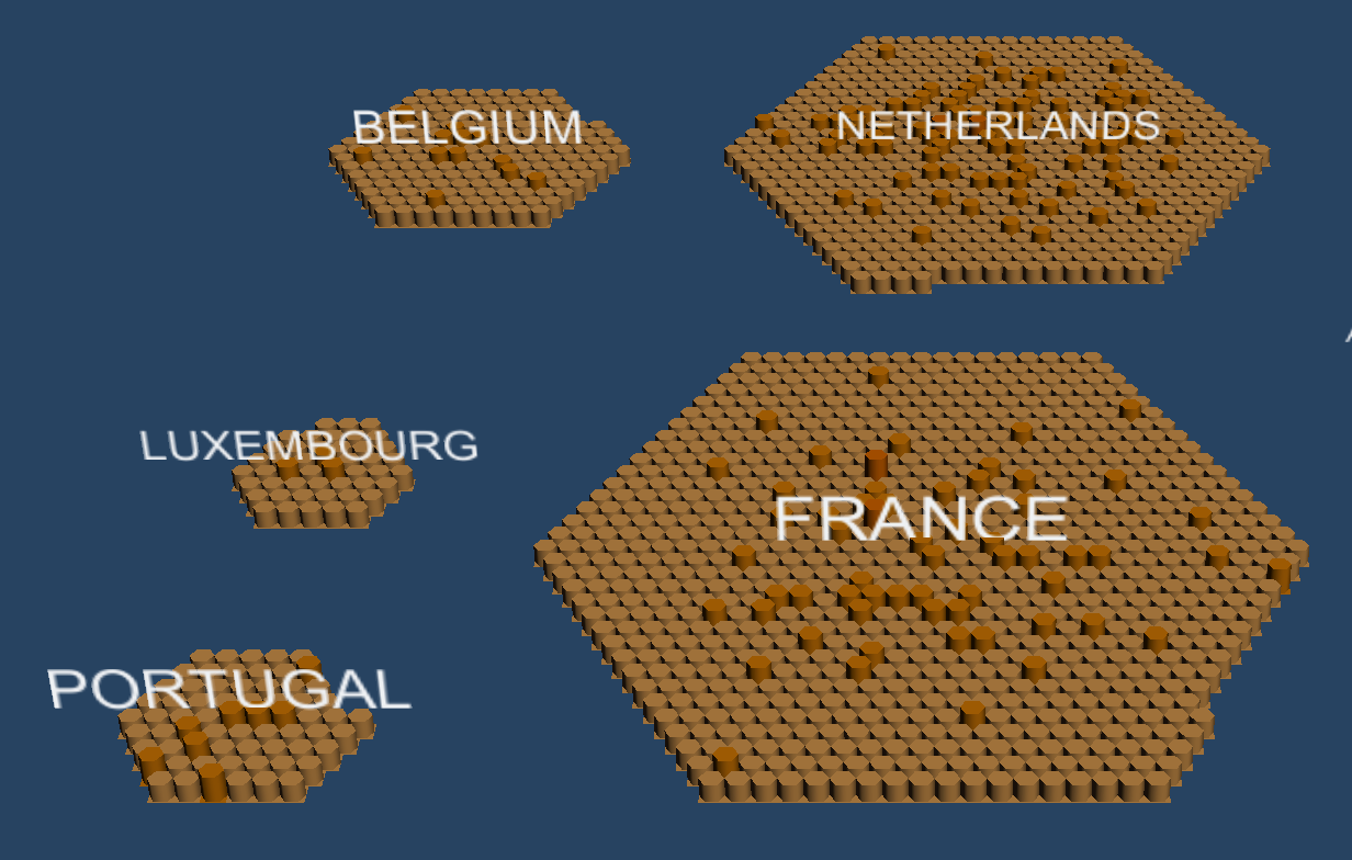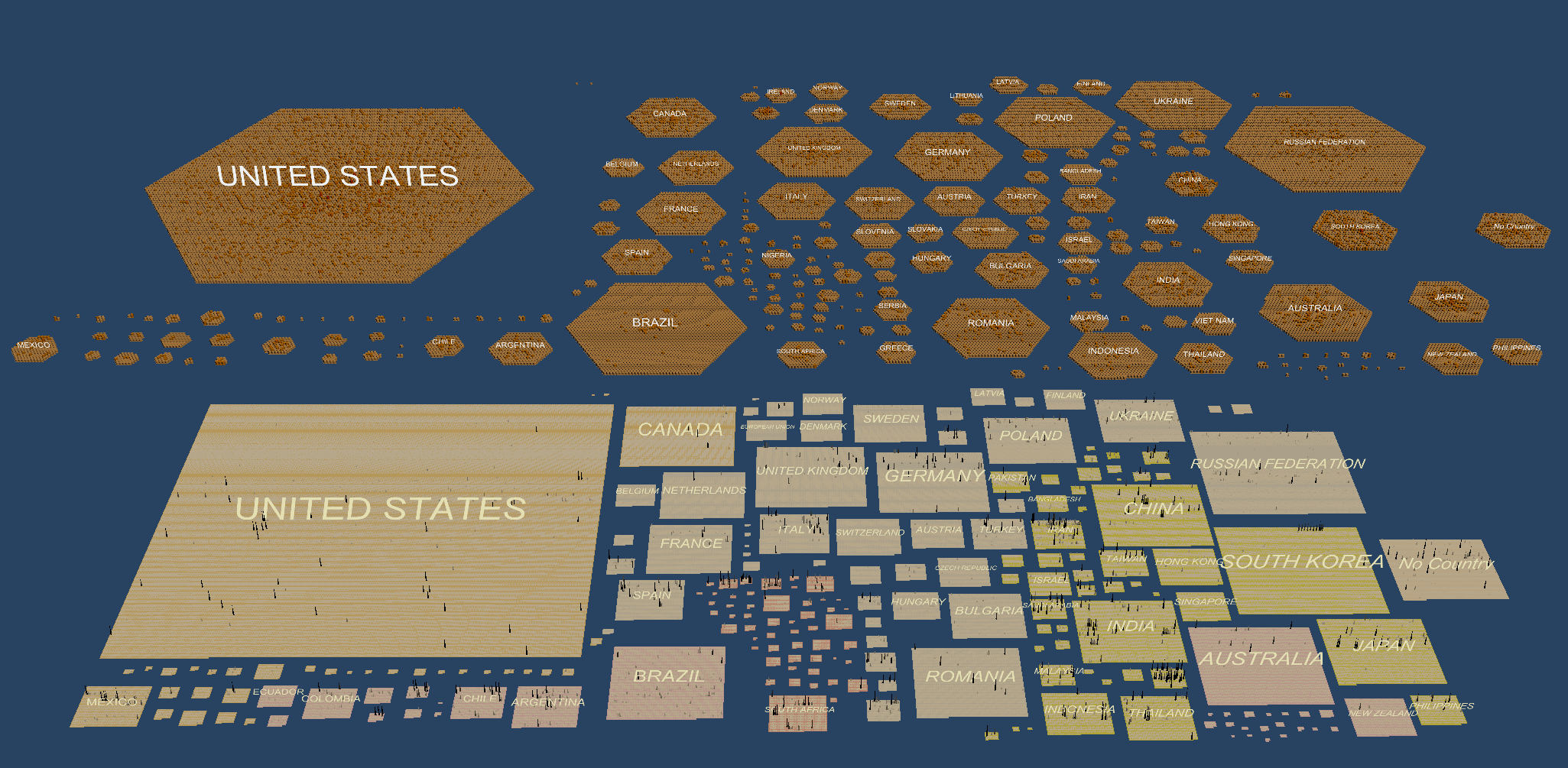 Both layers of this projection are loosely geographic, in the sense that the hexagons and squares are arrayed as closely as possible to Earth's geography (ignoring oceans, but respecting continental membership) while acknowledging that the land area of most countries is not a good representation of their Internet footprint. The resulting country layout is a geography much more relevant to the Internet while wasting considerably less display space. This is most apparent in a top-down view of both layers: