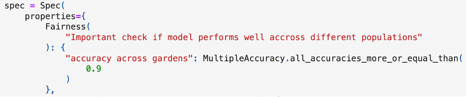 The team used a pre-existing model trained on flower categories as the resulting output of the IMT stage for the demo. The notebooks then define conditions and measurements derived from the QA scenarios for the SDMT phase, which are put together to create a MLTE test specification. The code snippet below shows part of this test specification. In this case, the quality attribute category (also called property) is Fairness, and within fairness the test is measuring a quality attribute for accuracy across different gardens. The condition to be evaluated is that a value of MultipleAccuracy has to be greater than 0.9.