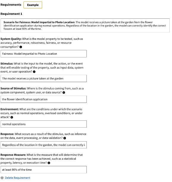 For this example, the team began by identifying the QA scenarios that are key to defining the ML model’s success. For example, the team determined that it was important for the model to correctly identify the correct flowers 90 percent of the time, regardless of where the photo was taken in the garden (fairness). Using these requirements, the team built out a negotiation card. The image below illustrates how the QA scenario appears in the negotiation card in the MLTE frontend.