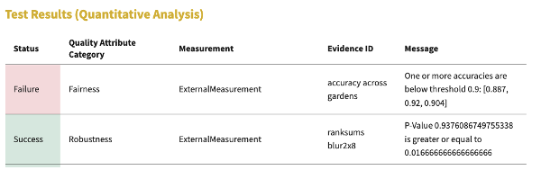 Once all of the evidence is collected, MLTE can automatically validate the measurement data from the tests against the test specification and generate a report to communicate the results. In this image of the report results in the MLTE frontend, we can see that the measurement for accuracy across gardens did not meet the test threshold condition, while the measurement for robustness did. From here, the team could decide to refine the model or the tests to improve the accuracy. This report also includes important pieces of information from the negotiation card and can be exported to be saved as a PDF.
