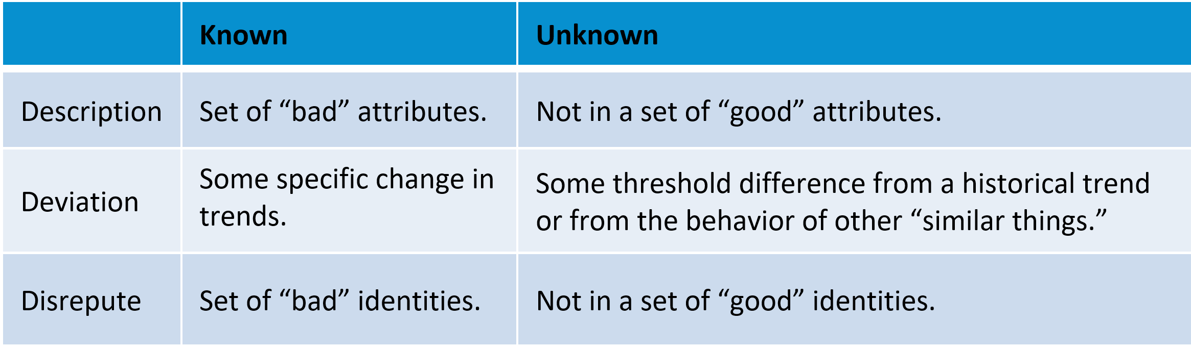 There are a number of common techniques that come up in discussions about detecting security problems, including signatures, anomalies, reputation, blocklists, indicators, knowns, unknowns, and deviations. Each technique may have a slightly different connotation depending on the person talking, and their definitions often overlap. To minimize possible confusion around these terms, we identify six categories of analytical methods for security-problem detection, which we represent as a matrix. We have three rows for types of analytics and two columns for whether we are creating the analytics based on specific information we want to find (known) or creating the analytics based on information that does not match the way we expect things to be (unknown).