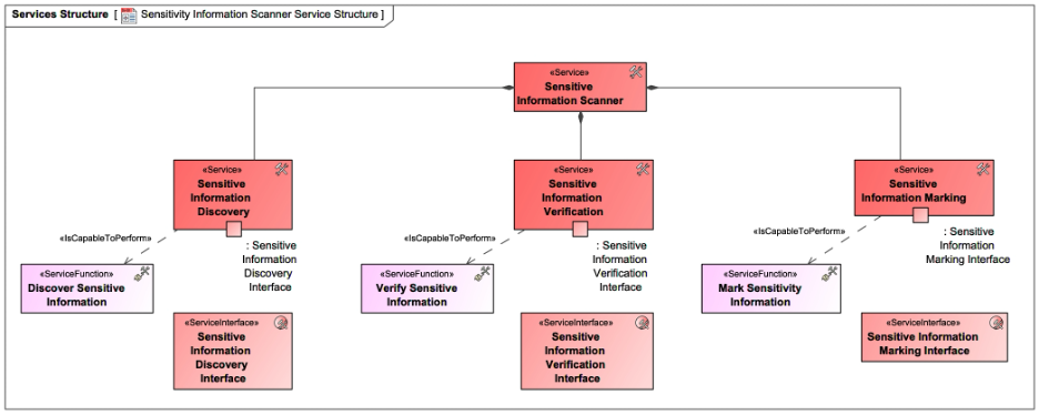 Figure 10 shows how a high-level service, such as “Sensitive Information Scanner” service, is decomposed into more specific services: “Sensitive Information Discovery”, “Sensitive Information Verification”, and “Sensitive Information Marking”, with identified interfaces and functions. An interface should be modeled as a standalone element for reuse and utilized as a type for a service port located on the service. To illustrate that, on the service structure view in Figure 10, the second-tier “Sensitive Information Discovery” service has a service port typed by “Sensitive Information Discovery” interface and linked to the behavior element service function “Discover Sensitive Information” by <IsCapableToPerform> relationship. Further modeling can add an activity to the service functions and implementation traceability, as shown by the CRM example.