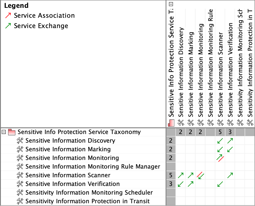 The dependency matrix in Figure 12 below shows all types of connections between services in the model. “Sensitive Information Monitoring” service interacts with “Sensitive Information Scanner” service via a service association with information exchange allocated to it. Services that constitute “Sensitive Information Scanner” service interact with each other using service connectors, port to port, with information exchanges allocated to them, in the same way as described above. The matrix is a useful instrument to analyze connectivity between services in bulk, identify wrongly connected services or missing connections, as well as the impacted services if one of them were to be changed.