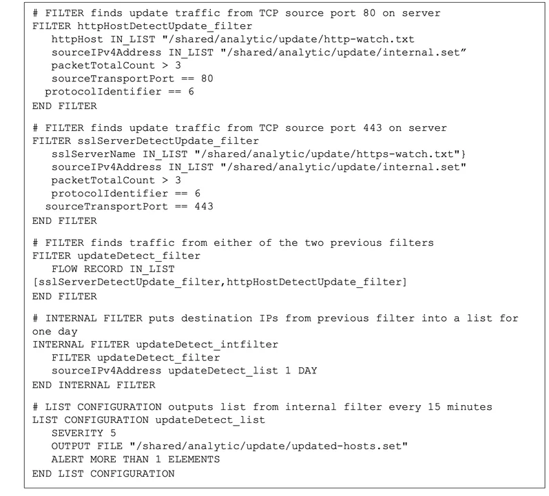 The second filter, sslServerDetectUpdate_filter, follows a similar process but uses the sslServerName matched against the HTTPS server list and the HTTPS common port (TCP/443). The output of these two filters is combined in the third filter, updateDetect_filter, which in turn is invoked by the internal filter, updateDetect_intfilter, to construct a daily list of addresses on the monitored network that have contacts from the update servers. This list is reported to a file by the list configuration, updateDetect_list. Analysis Pipeline produces only this set file as an output, so no display is shown in Figure 2.