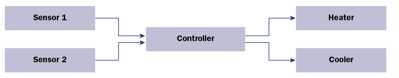 We illustrate the attack impact analysis with a simple example of a temperature controller. In this architecture, two sensors (Sensor 1 and Sensor 2) are connected to a controller. The controller then activates the heater or cooler components based on the temperature.