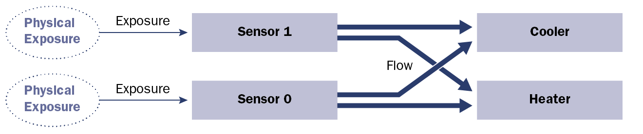There is a data flow between each sensor (Sensor 1 and Sensor 2) and the actuators (heater and cooler). The sensors are physically exposed to attackers and can be tampered with or altered. From a security perspective, this would allow injection of compromised data to the controller to ultimately alter the heater or cooler.