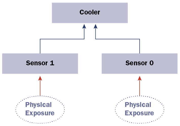 We capture the vulnerability (physical exposure) and the data flow relation between the sensors and actuators (cooler and heater). We remove the intermediate controller: the components that are ultimately impacted are the actuators (cooler and heater). This graphical model provides the ability to analyze the impact of a vulnerability (physical exposure in the present case) and how it impacts other components (cooler and heater). Propagation includes data flow, bus connections, shared processor, and memories.