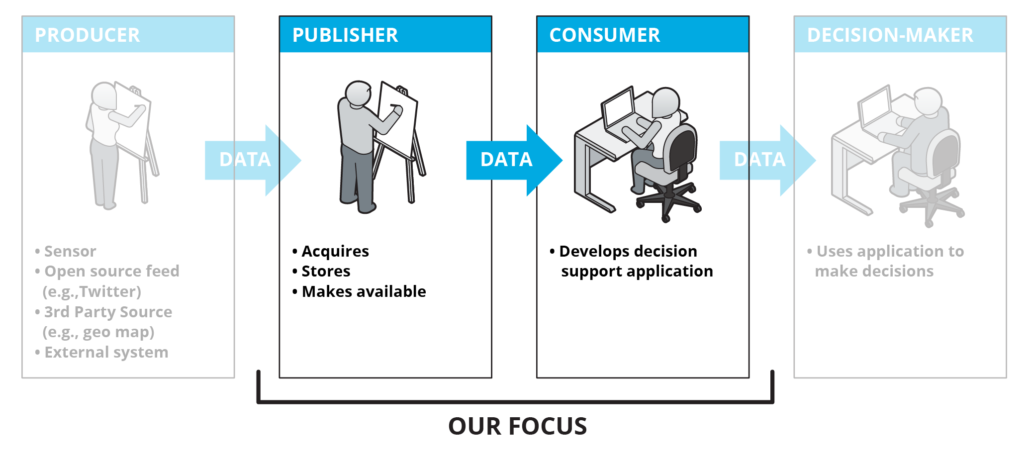 We are going to focus on the Publisher and Consumer. In many cases, the Producer is outside the scope of our authority, and the Decision-Maker is executing a business or mission process that is also outside of our authority. We'll focus on things we can control.