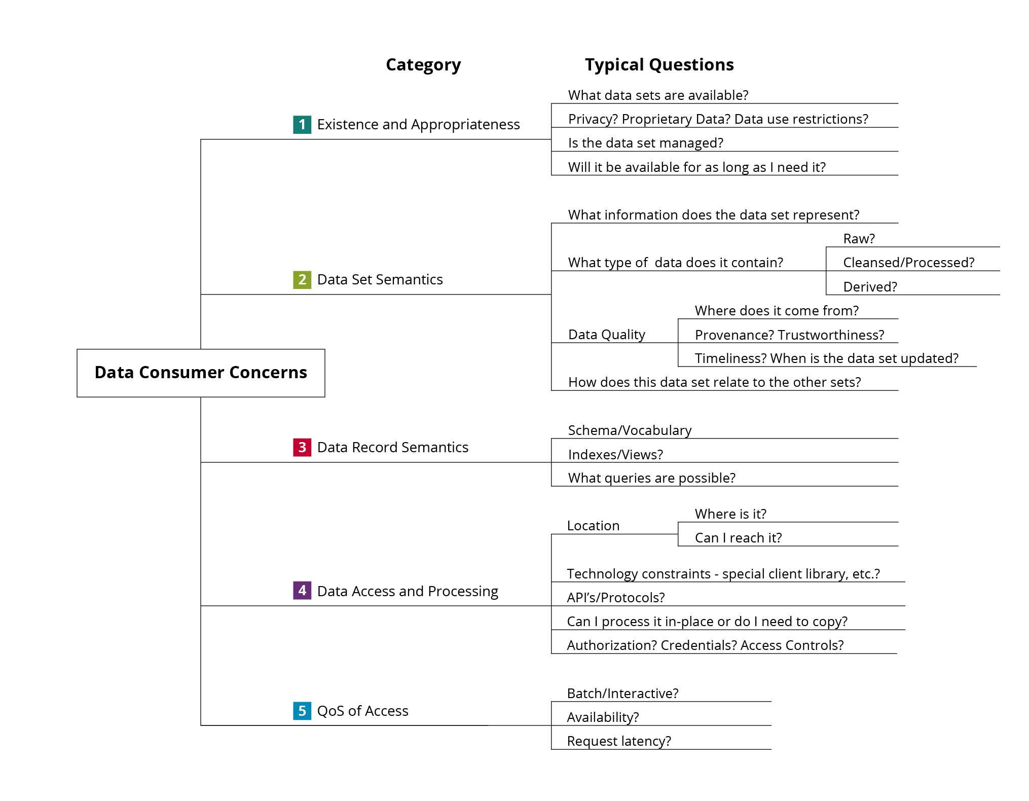 To focus on what data Consumers want, we have created a five-part Data Consumer Concerns framework to categorize their concerns. The framework categories provide a checklist, and for each category, we provide some typical questions that a data Consumer would need to answer to effectively use a data set.