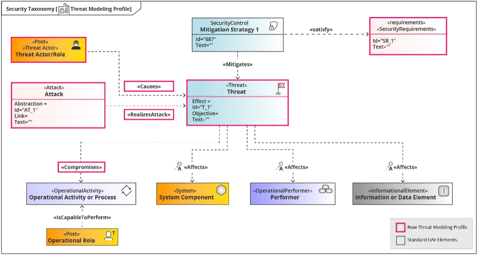 For the diagram elements highlighted in red, our team has extended the standard UAF with new elements (<<Attack>>, <<Threat>>, <<Threat Actor>> and <<Security Requirement>> blocks) as well as new relationships between them (<<Causes>>, <<Realizes Attack>> and <<Compromises>>). These additions capture the effects of a threat scenario in our model. Capturing these scenarios helps answer the question, What can go wrong?