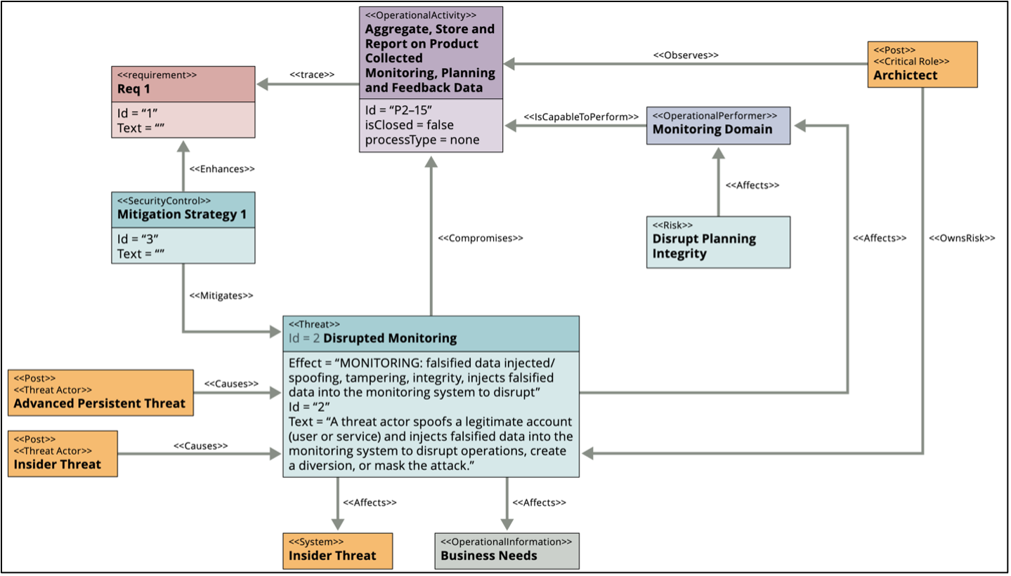 Here I provide an example of how to apply this profile. First, we need to define part of a system we want to build and some of the components and their interactions. If we are building a software system that requires a monitoring and logging capability, there could be a threat of disruption of that monitoring and logging service. An example threat scenario written in the style of our template would be, A threat actor spoofs a legitimate account (user or service) and injects falsified data into the monitoring system to disrupt operations, create a diversion, or mask the attack. This is a good start. Next, we can incorporate the elements from this scenario into the model. Represented in a security taxonomy diagram, this threat scenario would resemble Figure 2 below.